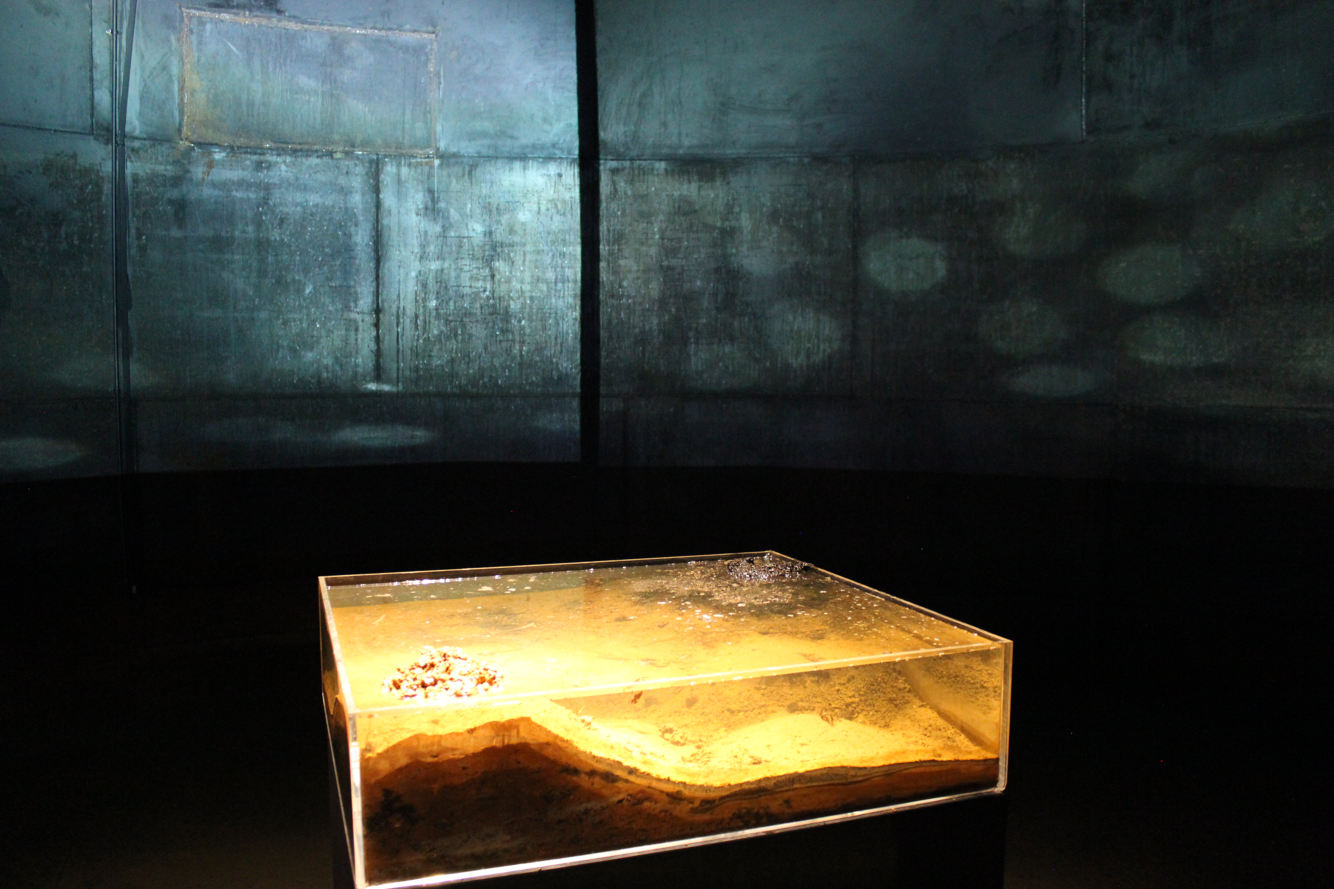 Red clay, soil, water and acrylic container. 90×80×35cm.